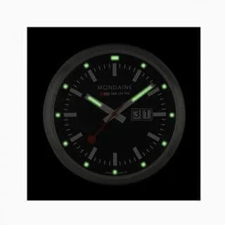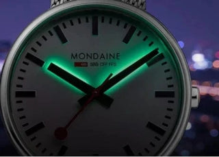 Mondaine BackLight technology allows the hands to be seen clearly at night without compromising the visual impact of the design. The thin Swiss-made luminous foil made of extra strong Superluminova material is attached to the back of the hands.