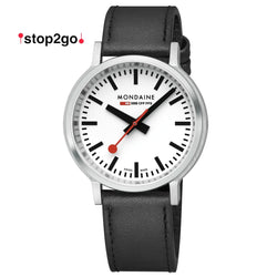 The stop2go collection not only inherits the minimalist and timeless design of the Swiss station clocks but also features a unique watch movement resembling that of this iconic clock. The distinctive red second hand of the wristwatch makes a full circle turn in 58 seconds and then waits for 2 seconds when it reaches the hour, allowing the minute hand to elegantly jump to the next minute. With its strong link to the history of the Swiss Railways clock, the stop2go is a true homage to MONDAINE's Swiss heritage and design. This extraordinary timepiece invites everyone to seize the opportunity and pause time, in a world that never seems to stop moving.
