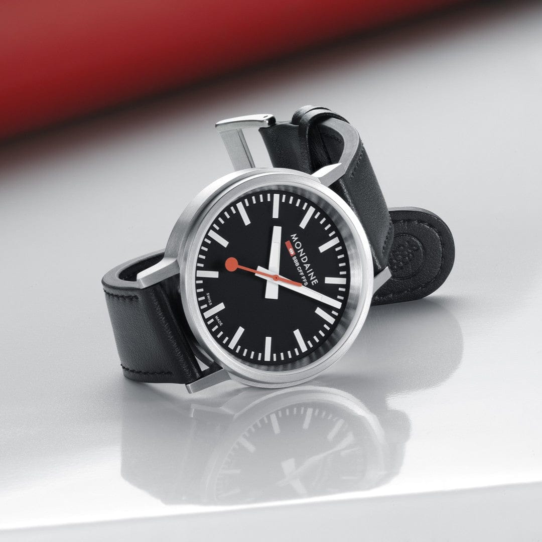 The stop2go collection not only inherits the minimalist and timeless design of the Swiss station clocks but also features a unique watch movement resembling that of this iconic clock. The distinctive red second hand of the wristwatch makes a full circle turn in 58 seconds and then waits for 2 seconds when it reaches the hour, allowing the minute hand to elegantly jump to the next minute. With its strong link to the history of the Swiss Railways clock, the stop2go is a true homage to MONDAINE's Swiss heritage and design. This extraordinary timepiece invites everyone to seize the opportunity and pause time, in a world that never seems to stop moving.
