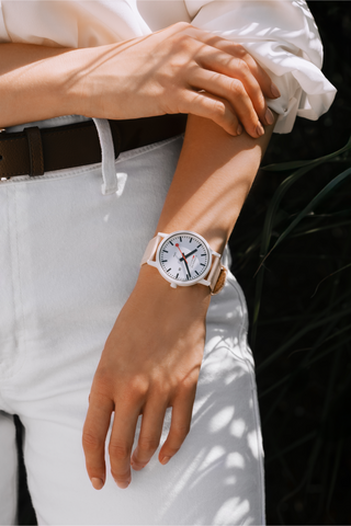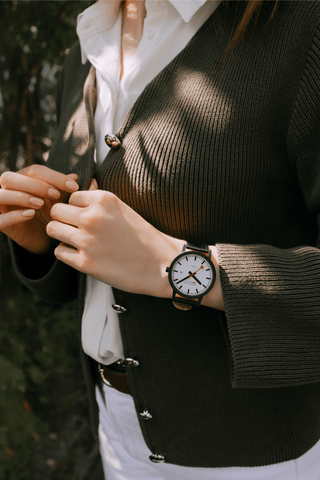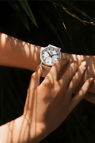 Das charakteristische Zifferblatt und die Anordnung der Zeiger entsprechen dem Originaldesign der Uhren, die seit 1944 in rund 3.000 Schweizer Bahnhöfen der SBB zu finden sind und für die MONDAINE seit 1986 eine weltweite Exklusivlizenz besitzt. Das minimalistische, klare schwarz-weiße Zifferblatt sorgt für eine hervorragende Lesbarkeit und optimale visuelle Orientierung.